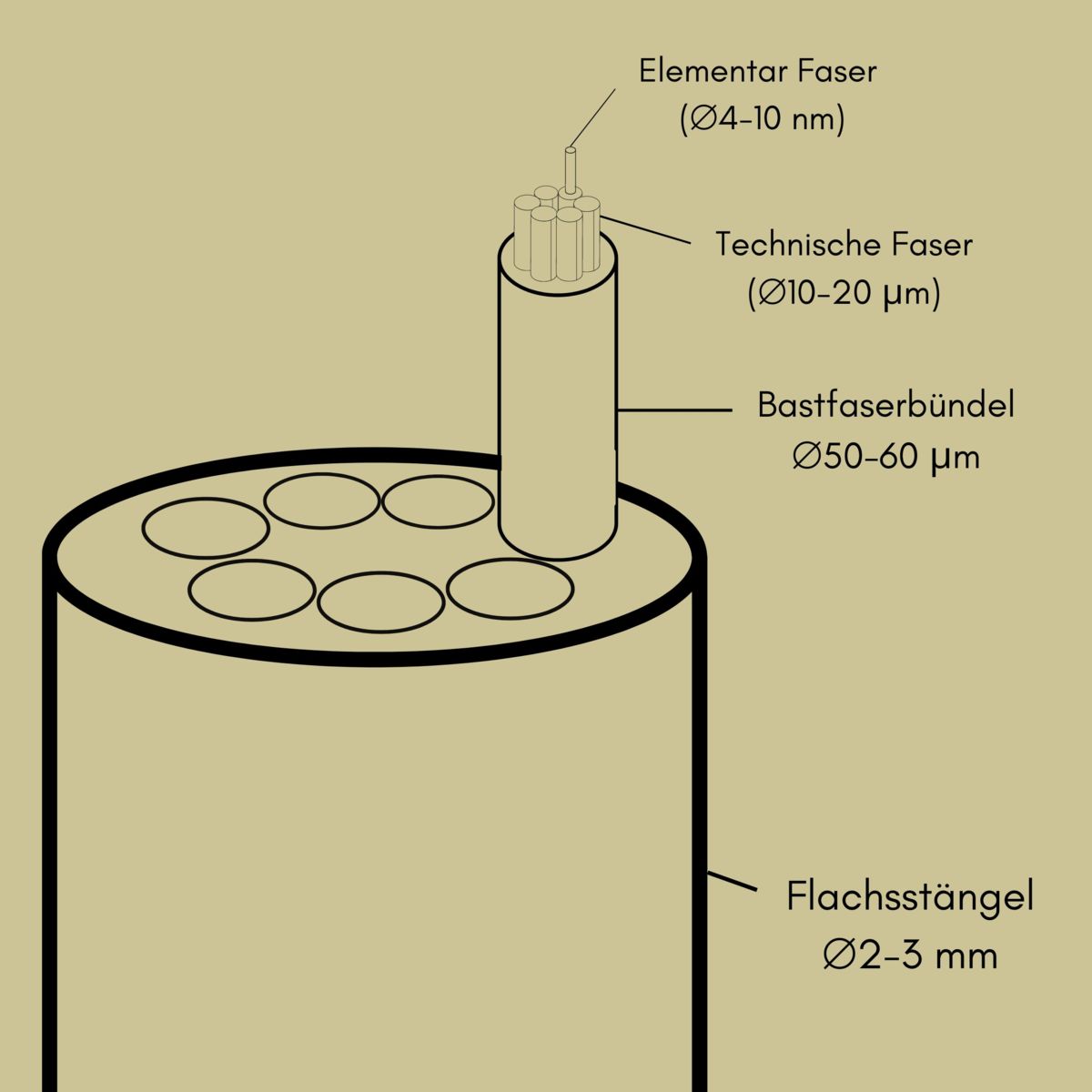 Werden die Eigenschaften von Leinen mit Baumwolle verglichen, stellt sich heraus, dass Leinenfasern nur wenig gröber sind als Baumwollfasern. Die Struktur der Leinenfaser ist jedoch gänzlich verschieden von der, der Baumwolle. Die Leinenfaser befindet sich zu Bastfaserbündeln zusammengefasst im Flachsstängel. Die Bastfaserbündel bestehen wiederum aus einzelnen Faserbündel (technische Faser), die ebenfalls wieder aus einzelnen Fasern, den Elementarfasern, zusammengesetzt sind. Die technische Faser ist 20 bis 80 cm lang, während die Elementarfaser nur 2 bis 4 cm lang ist.