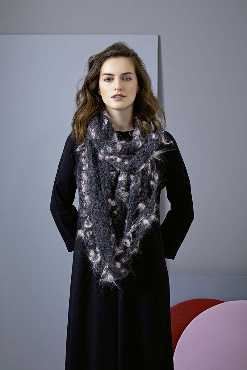 Hochmodisches Fantasiegarn. Die gerauten, bunten Mohair Fasern kontrastieren mit dem neutralen Grundton des Gestrickes und verleihen dem Gestrick das besondere Etwas.