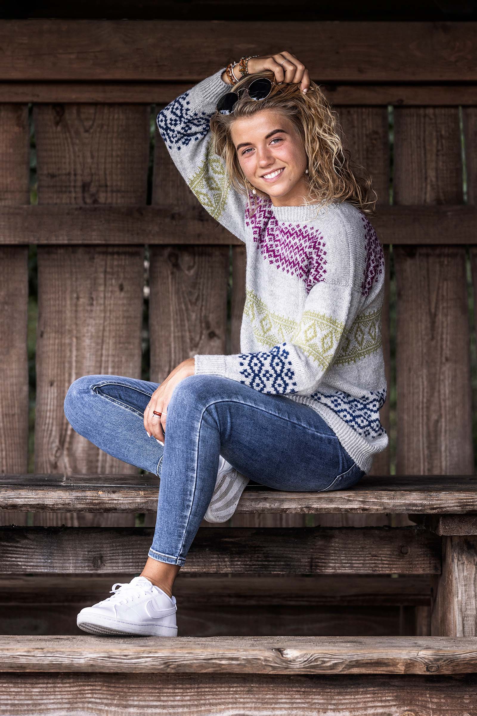 We present: Nordic Touch by Sanne Lousdal, a sweater that captures the essence of Scandinavia. Knit seamlessly in the round, from the hem to the neckline, this impressive piece showcases three distinctly delineated bands with diverse color patterns. Against a neutral backdrop, three unique motifs and color combinations evoke the spirit of Nordic heritage. Each motif, intricately worked into the fabric, reflects the charm of traditional Scandinavian patterns.