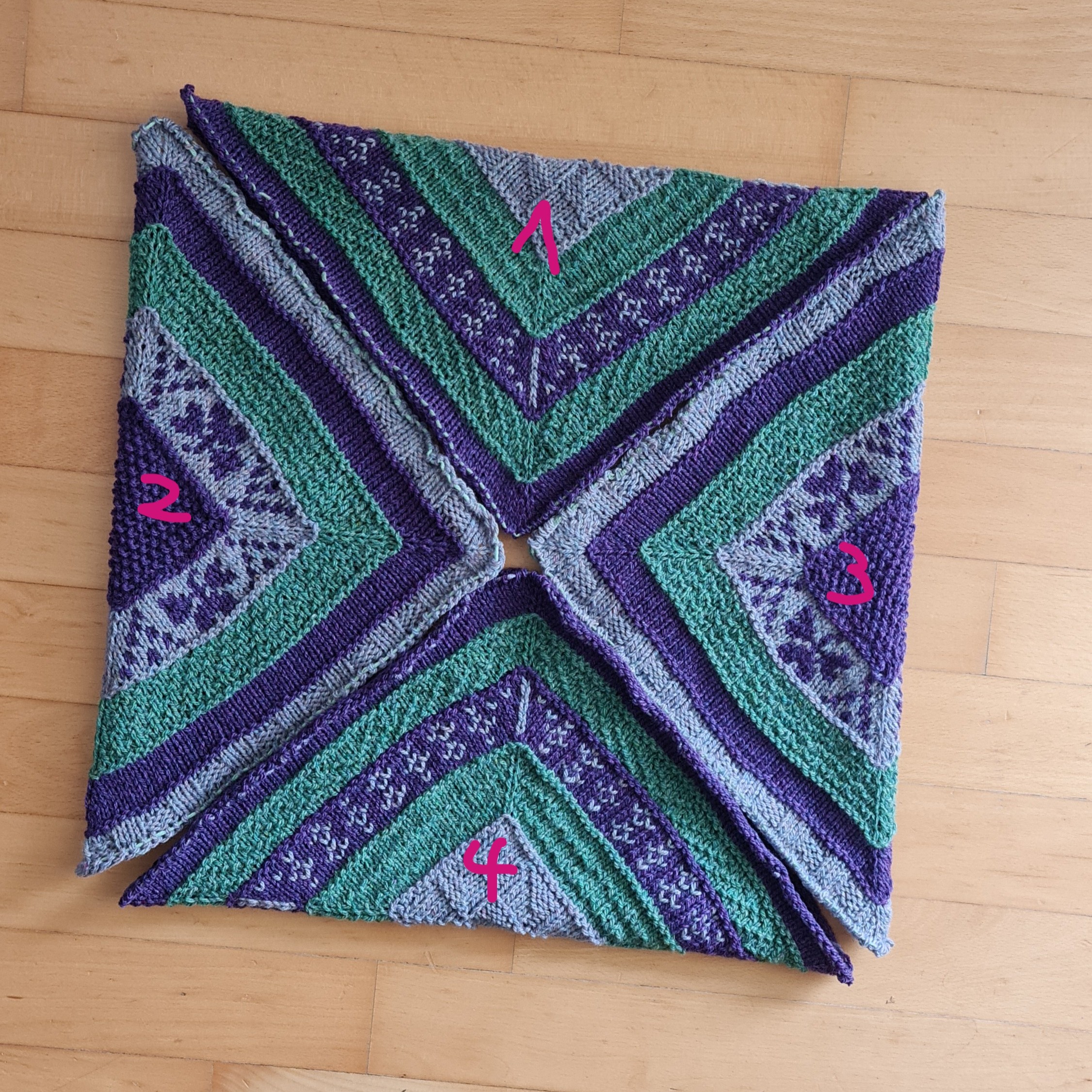 Nous tricotons avec le fil DONEGAL WOOLEN SPUN en trois couleurs : une claire, une moyenne et une foncée. Veillez à ce qu’il y ait suffisamment de contraste entre la couleur la plus claire et la plus foncée pour le jacquard, si vous choisissez de le tricoter. Le projet se compose de quatre carrés, dont deux identiques à chaque fois, qui seront ensuite assemblés pour former le coussin.